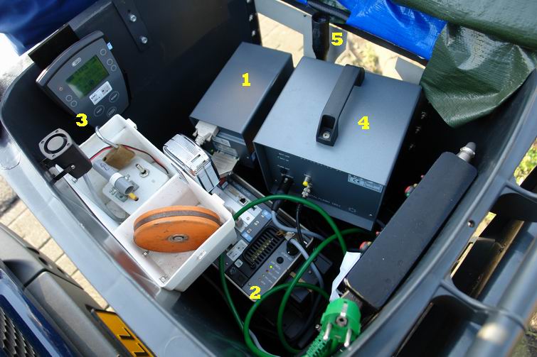 Daaronder -van buiten niet te zien- bevindt zich de radarantenne, die (nu nog) dwars door de plastic wand van de kliko straalt.