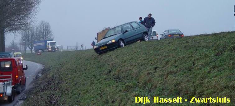 Op de heenweg troffen wij nog dit voertuig aan, dat op de helling van de spiegelgladde dijk tussen Hasselt en Zwartsluis balanceerde.
