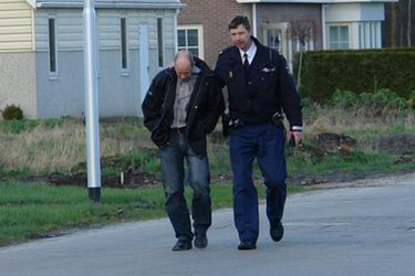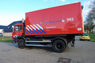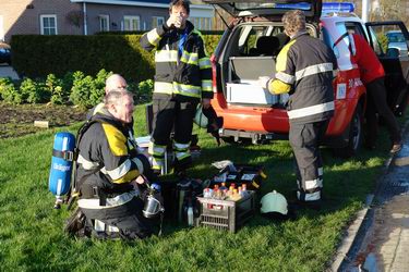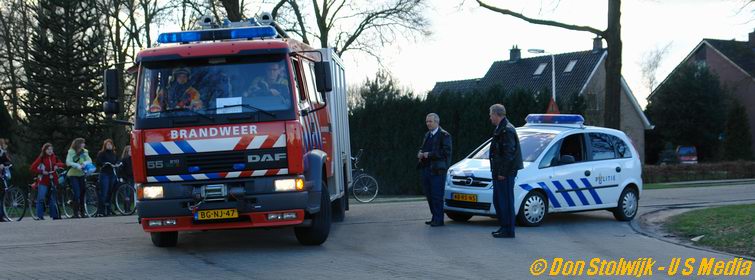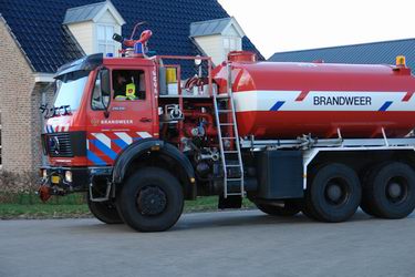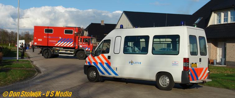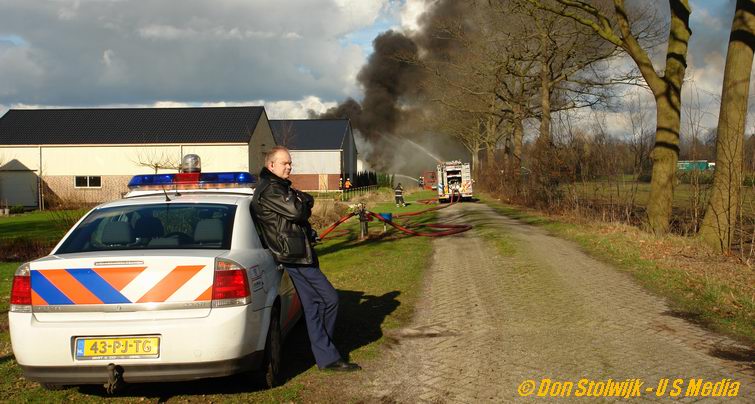 Links: de onthutste eigenaar van het bedrijf wordt door de politie op zijn gemak gesteld. Rechts: tankwagen van de Ommer brandweer.