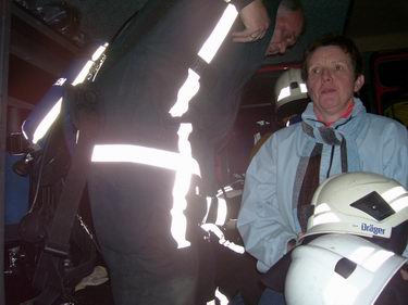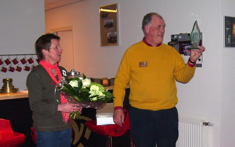 Kor memoreerde daar de afgelopen jaren en kwam tot de conclusie, dat er veel was veranderd. Zo hadden ze ooit met drie man bij de kazerne gestaan om uit te rukken - dat kon toen nog gewoon met drie of wat er nog meer kwam. Maarre: wie bestuurt die auto? Geen van de drie was chauffeur ! (Hoe dit opgelost is, laat zich raden!). Kor werd echt gemeend bedankt voor de afgelopen jaren. Hij kreeg als aandenken een brandweervlam van glas met het oude brandweerlogo (oud brandweerman nu, hè) met inscriptie. Zijn vrouw, die zeker net zoveel brandweerman was ( bedankt voor al die nachtelijke bonensoep tijdens het zoeken naar de jobingstaf) kreeg een boeket bloemen. Kor en Roelie, namens de ploeg van De Wijk - Koekange heel erg bedankt !