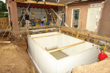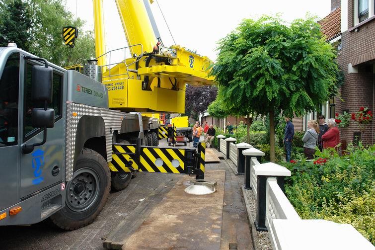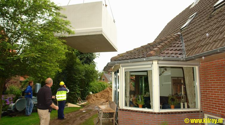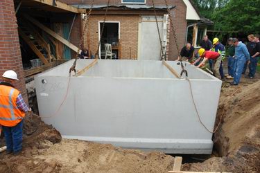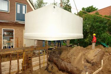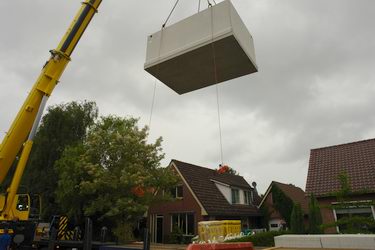 Prefab kelder van zeventien ton feilloos over woning op z'n plaats getild