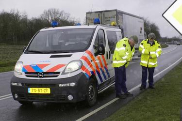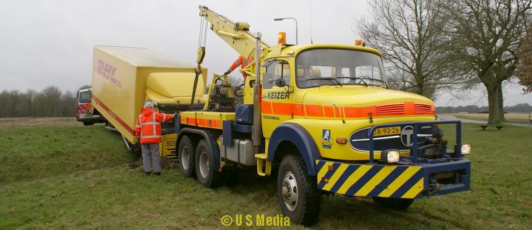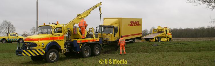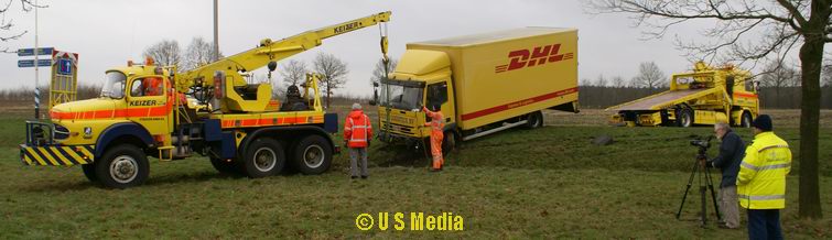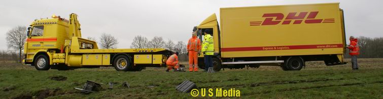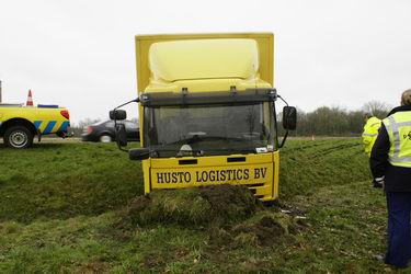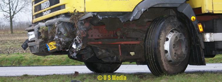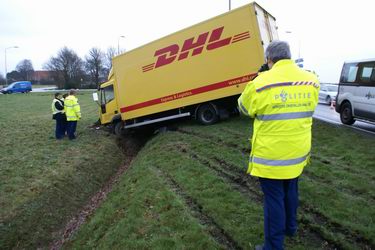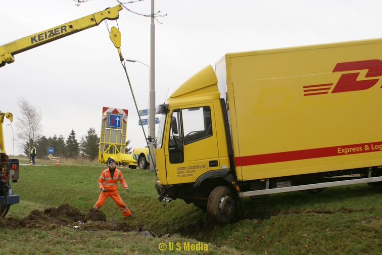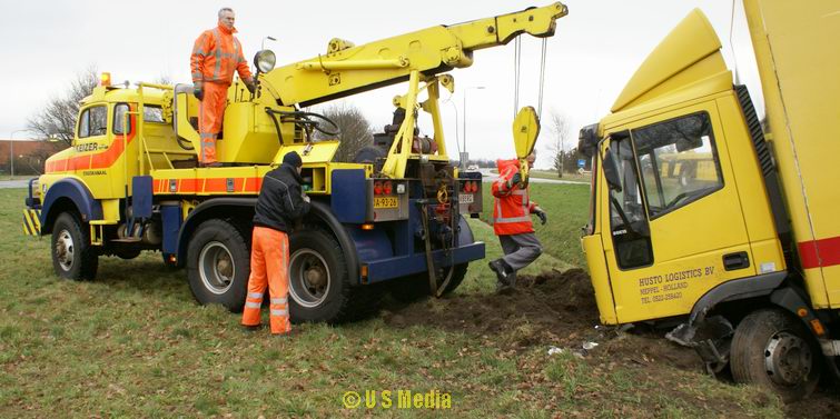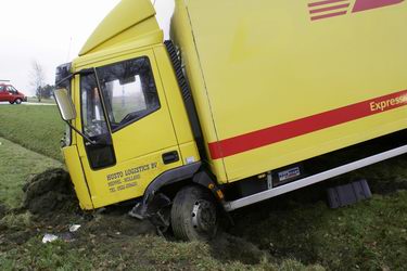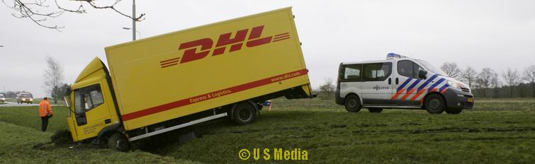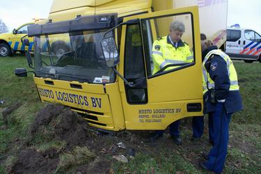 Dinsdag 5 februari 2008 N374 1 km ten oosten van Borger Vrachtwagen duikt droge sloot in na windvlaag . .