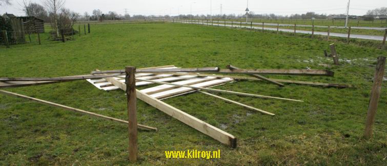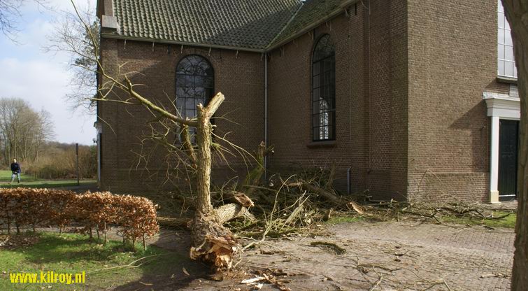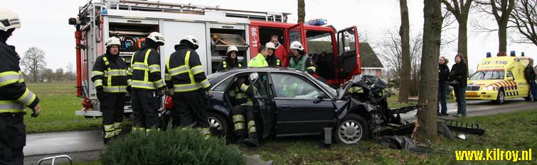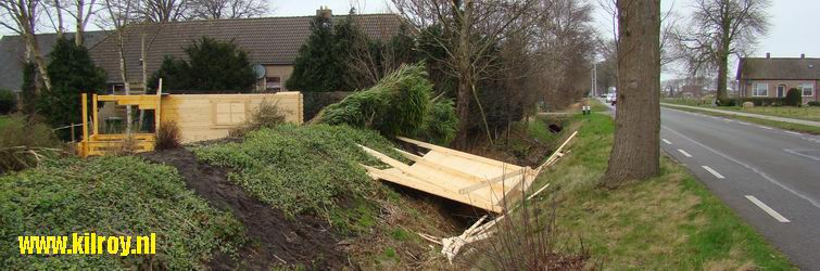 ![]() De brandweer verwijderde het dak van de auto en haalde de vrouw middels een wervelplank rechtstandig uit het wrak. De vrouw is met o.a. nekklachten overgebracht naar het ziekenhuis. Berger Kraal sleepte het voertuig af. Foto's: Hans Spang - www.kilroy.nl Nieuwlande: hoge boom dreigt op woonboerderij te vallen De blusgroep De Krim kreeg gisteren om 18:39 uur een hulpverleningsopdracht, die veel tijd in beslag zou gaan nemen. Aan de Nieuwlandseweg, even voor Nieuwlande, was een zeker twintig meter boom ontworteld en vervaarlijk scheef gezakt. ![]() Een andere boom weerhield het gevaarte ervan op een woonboerderij te vallen, maar het was maar de vraag of dat zo zou blijven. Ook hier werden de hoogwerker en de kettingzaag ingezet om de boom van takken te ontdoen. Aan het eind van de klus -tegen tienen- leunde het nu kaalgeslagen gevaarte nog steeds tegen zijn collega. Omdat de kans, dat de boom op de woning kon vallen, nu geweken was, besloot men de operatie te staken. Maandag zal verder worden gekeken, wat er moet gebeuren. De omgeving is met linten afgezet. Aan de Riegshoogtendijk tussen Slagharen en Hollandscheveld sneuvelde een houten tuinhuis. Een forse windvlaag rukte het dak er af en smeet het enkele meters verderop in de bermsloot. Het leverde geen gevaar op voor het verkeer. ![]() In de berm van de Rheezerveenseweg in Heemserveen was een opmerkelijk fenomeen te zien. ![]() Vijf trompetnarcissen hadden het hard te verduren, maar bleven overeind, terwijl elders in de omgeving diverse bomen ontworteld werden. (Meer reportages volgen)