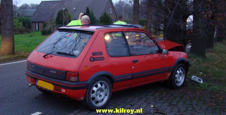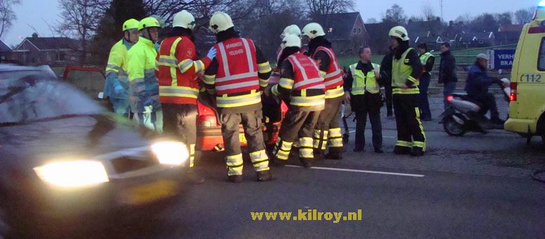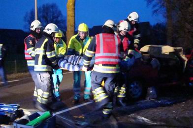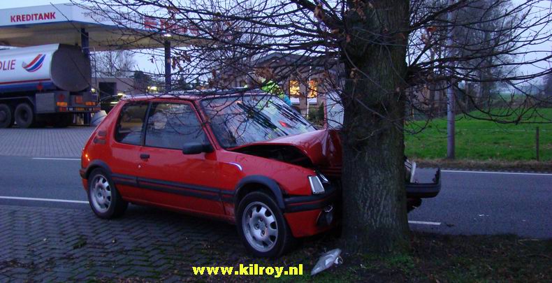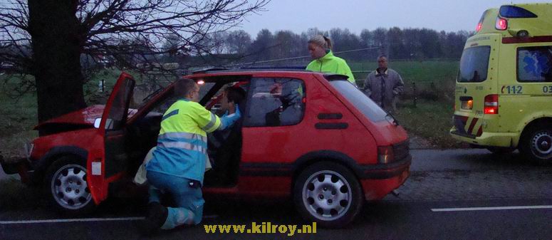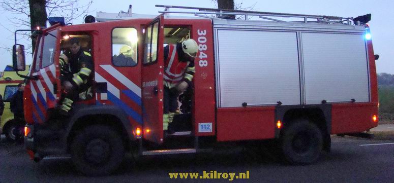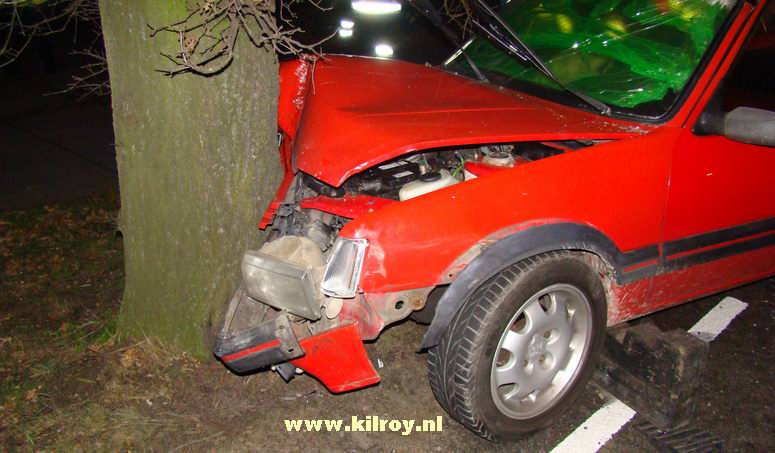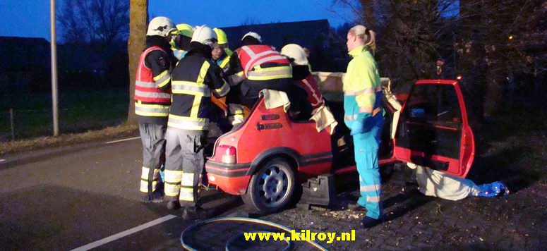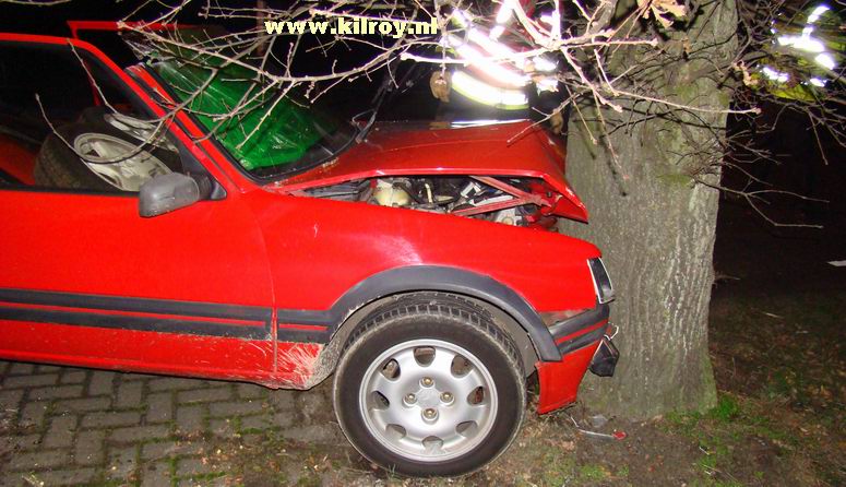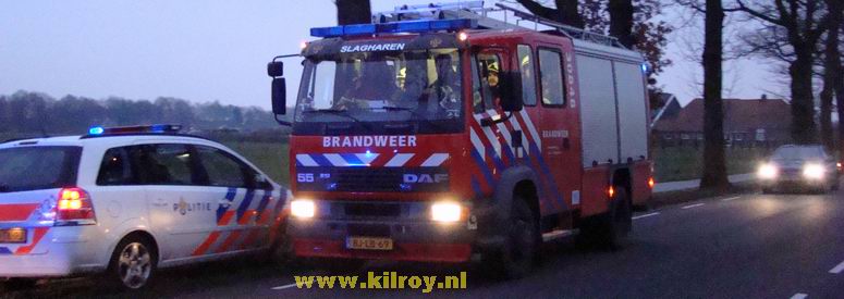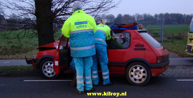 | Vrijdag 28 november 2008 Hollandscheveld ( Riegshoogtendijk ): Auto tegen boom na aanrijding - bestuurder gewond Ambulancepersoneel onderzoekt de bestuurder op letsel in afwachting van de komst van de Slagharense brandweer... ...die niet lang op zich liet wachten, ondanks de bijna 10 kilometer lange aanrijroute. Wel duurde het enige tijd, voor de weg ter plaatse verkeersvrij gemaakt werd en er zonder gevaar gewerkt kon worden. De bij de aanrijding betrokken SAAB 9-3 Sport Sedan liep vrij weing schade op. De berging van de gewonde man verliep voorspoedig - |