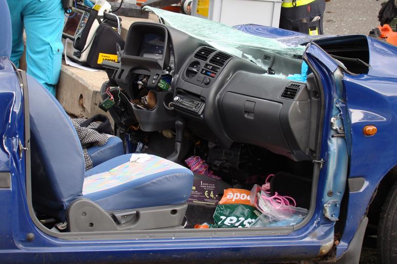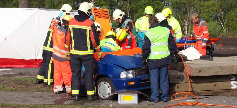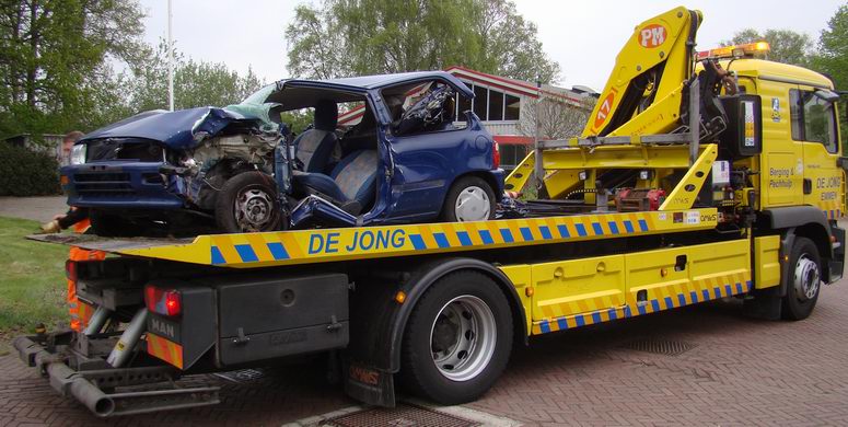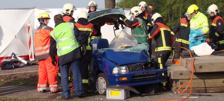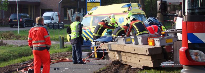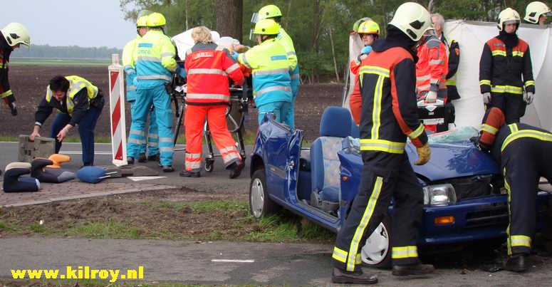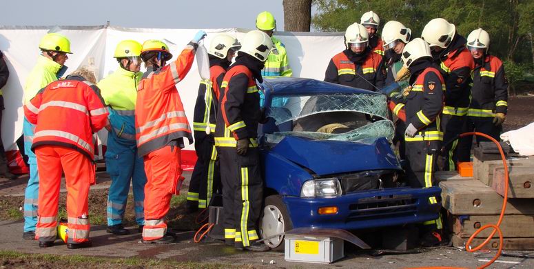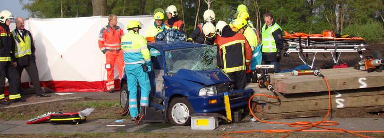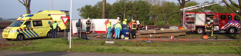 | Zaterdag 1 mei 2010 Schoonebeek ( Nieuw Amsterdamsestraat ): Automobiliste zwaar gewond na botsing met draglineschotten Het autootje had geen schijn van kans tegen de zware hardhouten rijplaten, die naar schatting elk anderhalve ton wegen. Om de gewonde vrouw te kunnen bevrijden, moest o.a. het stuur met een hydraulische schaar worden weggeknipt. |
