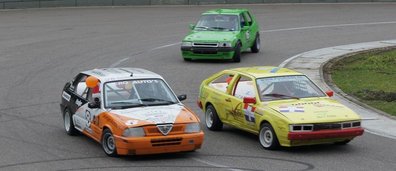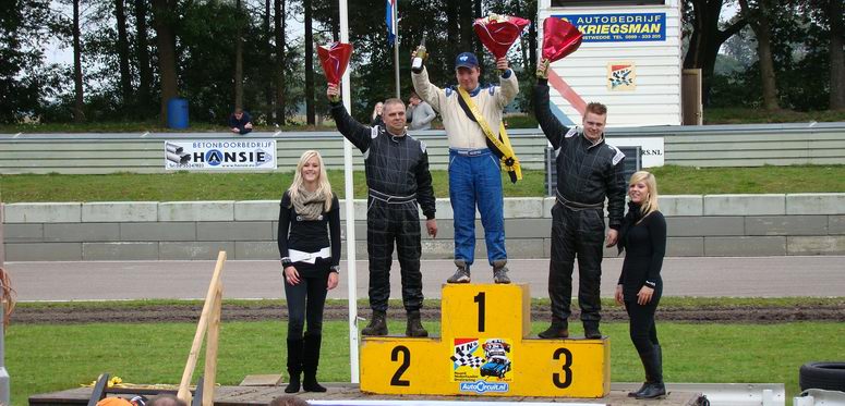 | Zoals gezegd was het in de 2000 8v klasse een strijd van jewelste tussen René en Tale Ottens. De eerste manche begon gelijk al slecht: René en Tale stonden naast elkaar op de laatste startrij. Twee ronden verder werd er geslipt en kwam René op grote achterstand te liggen. Tale reed inmiddels rustig zijn rondjes op de eerste plaats. Maar René kwam goed terug en eindigde alsnog als derde. Helaas kwam hierdoor het puntenverschil tussen Tale en René op vijf punten achterstand. De tweede manche begon René op de op één na laatste startrij, met Tale achter hem. Inmiddels was het een beetje gaan regenen en had René besloten om op regenbanden te starten. Een goede keus, zo bleek later, want hij eindigde alweer op de eerste plaats! Dat was goed voor de punten. Nu nog twee keer winnen en René was Nederlands kampioen! De derde manche begon René wederom op de laatste startrij aan de buitenkant; Tale aan de binnenkant. Het veld was inmiddels aardig uitgedund: reden nog maar vijf autos! Dus het was een vrij gemakkelijke opgave voor René om snel weer voren te rijden en die plaats de rest van de race vast te houden. Weer nummer één! Nu stond René nog slechts twee punten achter op Tale, maar om kampioen te worden, moest hij de finale winnen. Hij kwam dan weliswaar op hetzelfde puntenaantal te staan als Tale, maar als hij dan de finale gewonnen zou hebben, werd hij kampioen. Helaas ging dit in de finalemanche niet zo als we gehoopt hadden. Tale gaf René geen centimeter ruimte en het was een prachtig gevecht tussen de heren. Het ging er hard, maar netjes aan toe. Helaas eindigde René dus op de tweede plaats... geen kampioen, maar René werd wel dagwinnaar èn NNO clubkampioen ! Al hadden we natuurlijk ook gehoopt op het Nederlands kampioenschap. Misschien volgend jaar! In ieder geval hartelijk gefeliciteerd, Tale! |