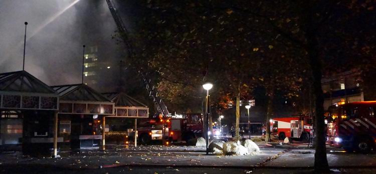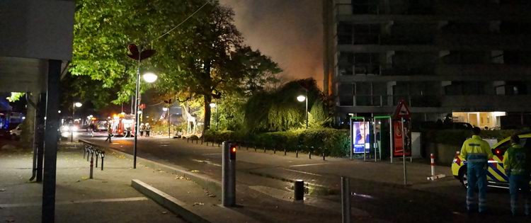Hieronder: de uitgebrande kantooorunit tussen de Ten Kate-flat en het wit-grijze gebouw. |
