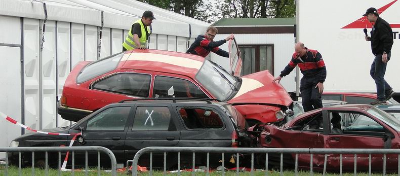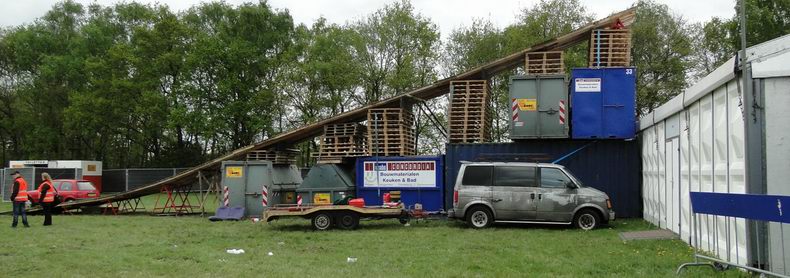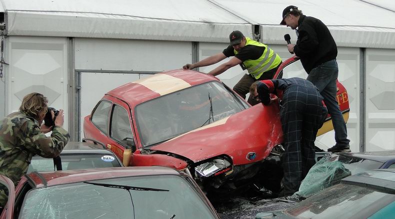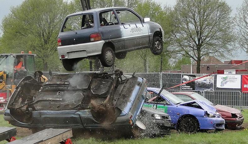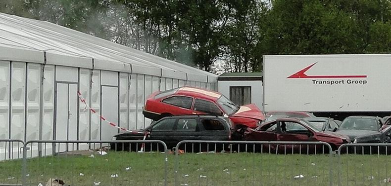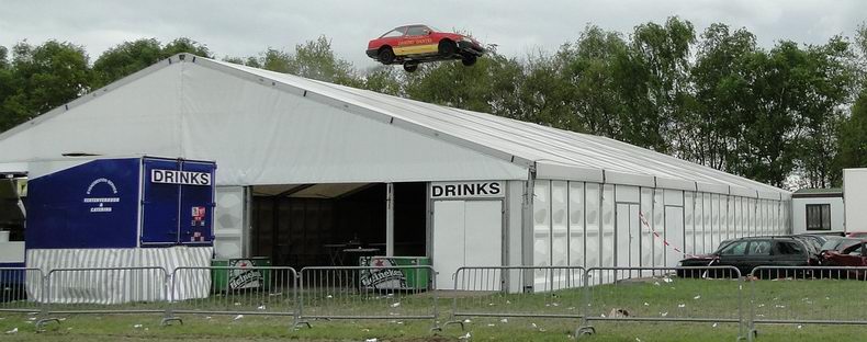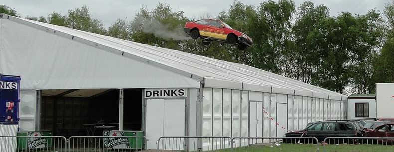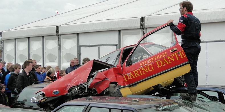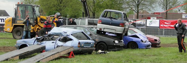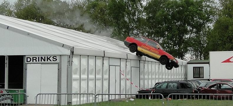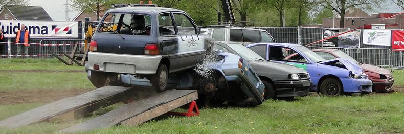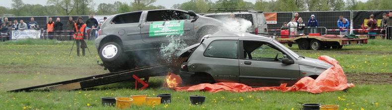 | Als afsluiting van de Autoblubbering volgde rond half zes de vierde en verreweg meest riskante stunt: Volgens het plan moest een auto van stuntteam Daring Dantes vaart maken op een grote springschans, over de feesttent vliegen en op een verzameling auto's landen. De spanning was te snijden, want in 2002 liep een poging van hetzelfde stuntteam, met een motor over het Overijssels Kanaal in Bergentheim te springen, fout af, toen de stuntman hard tegen de walkant klapte en gewond per ambulance afgevoerd most worden. (Video) Uiteraard werd het talrijke publiek op veilige afstand gehouden en werd uit en te na gecontroleerd, of iedereen de gevarenzone had verlaten. Na het sein "veilig" zagen de ademloos toekijkende Autoblubbering-fans de auto over het dak van de tent vliegen, maar de dolle vlucht bleek een paar centimeter te kort, waardoor de auto met het linker achterwiel de rand van de tent raakte, voordat hij met een doffe klap keihard op de eerste rij auto's neerstortte. Tot het uiterste gespannen wachtten de toeschouwers af, of de stuntman de enorme dreun heelhuids had doorstaan..... Wonder boven wonder kroop de dare-devil even later schijnbaar enigszins dizzy, maar zo te zien ongedeerd uit het wrak en stak zijn hand op, ten teken, dat alles okay was. Ook de feesttent kwam er zonder schade vanaf. |