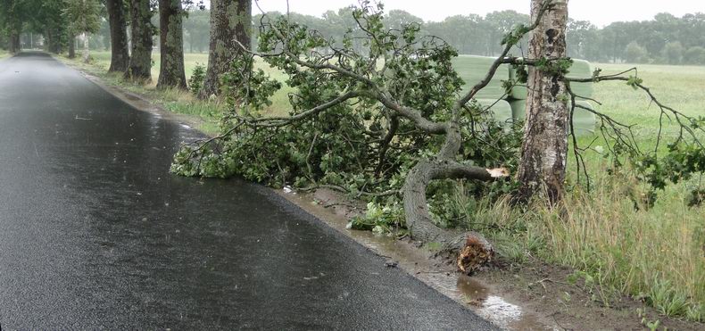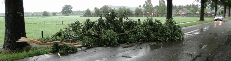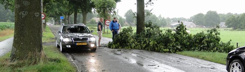 | De eerste stormschades in de regio werden pas na zessen zaterdagavond gemeld. Op de Dorpsstraat in Elim sneuvelden een boom en een grote tak en ook op de Carstendijk was het raak. Door het grote aantal uitrukken bleven deze stukken flora geruime tijd op de weg liggen en werd het slalommen om er langs te komen. |