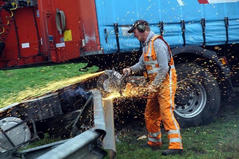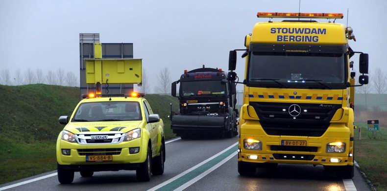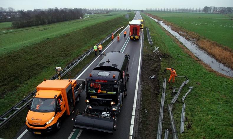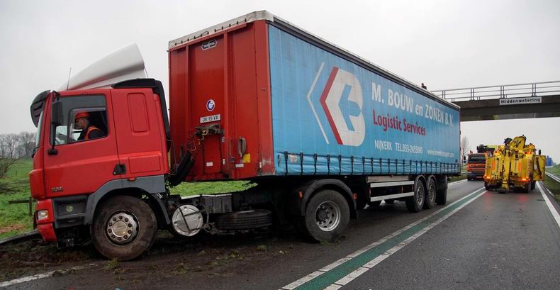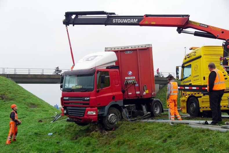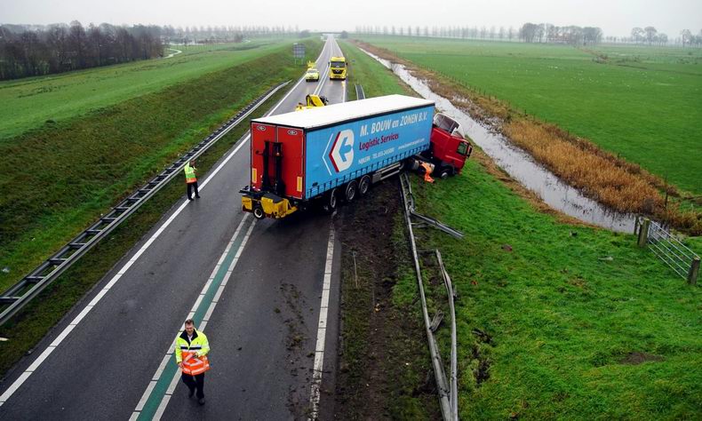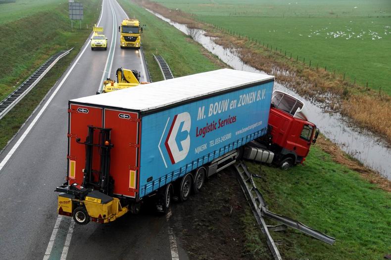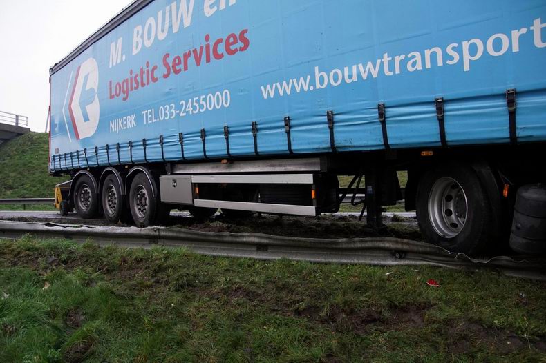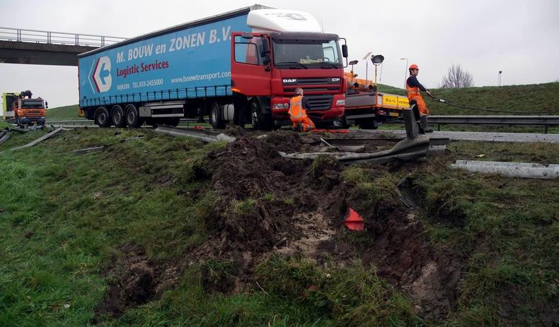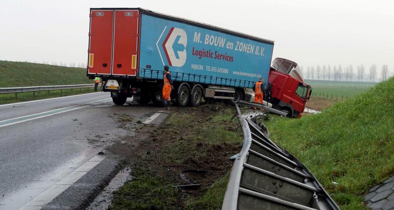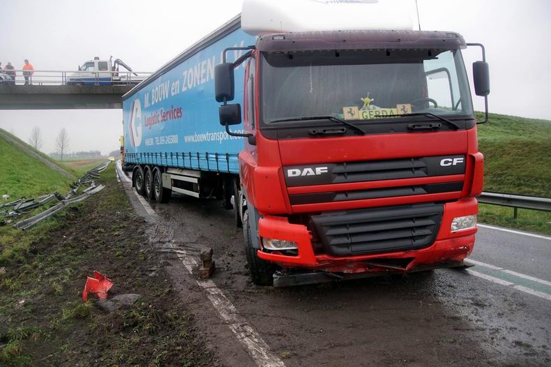 Vrachtwagencombinatie door de vangrail